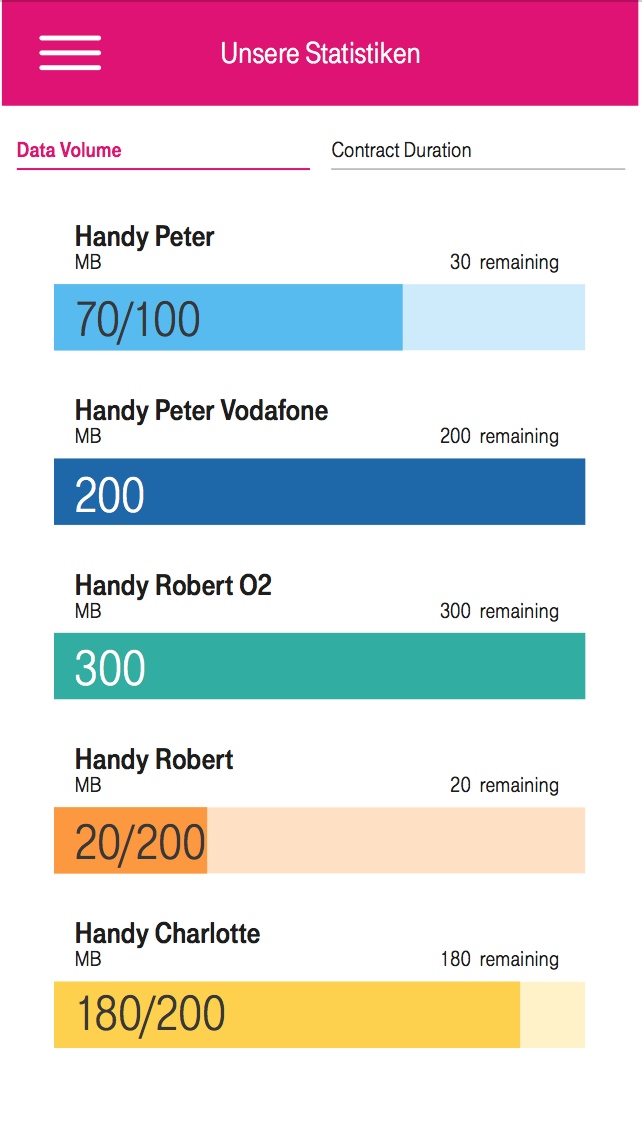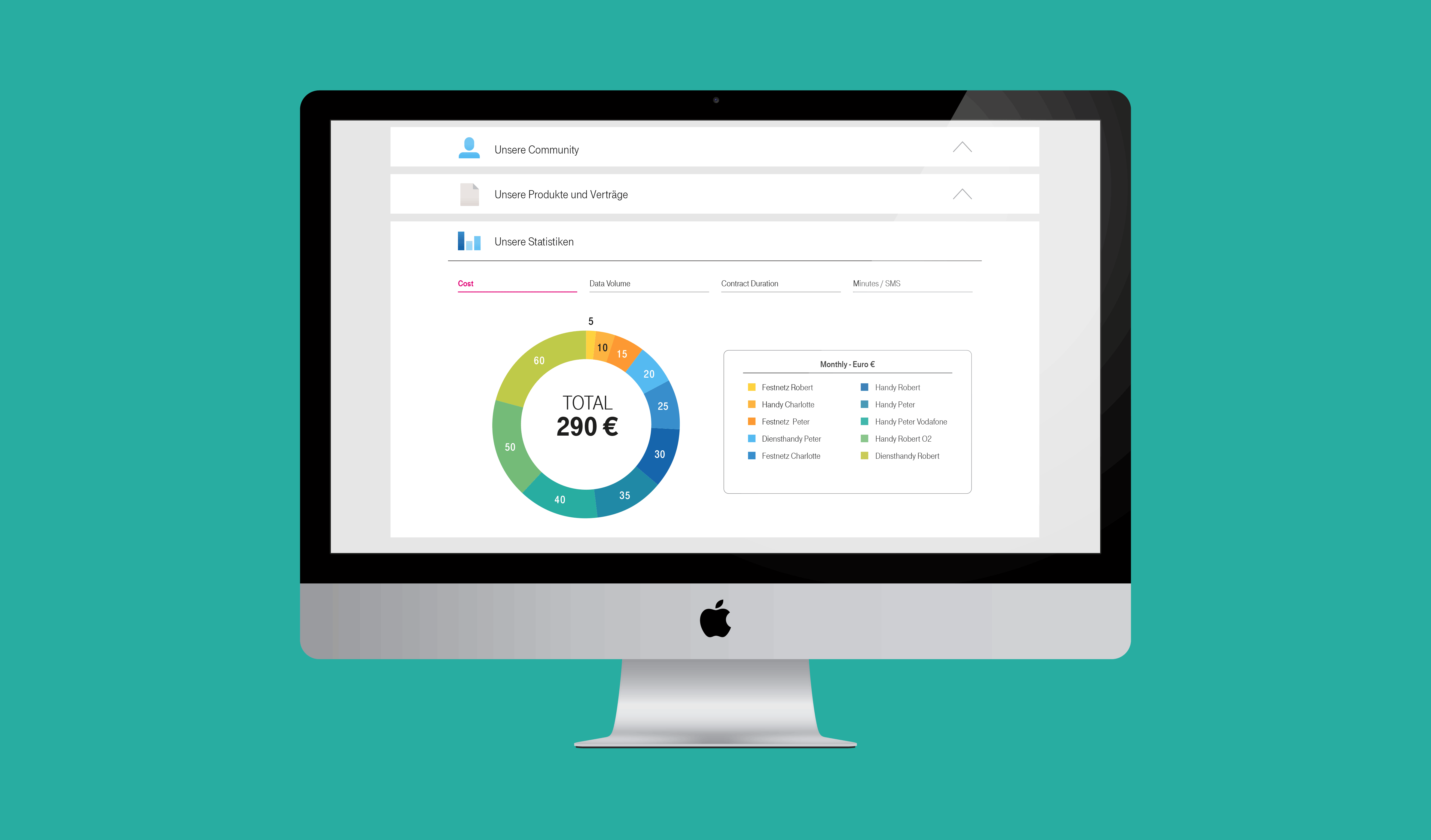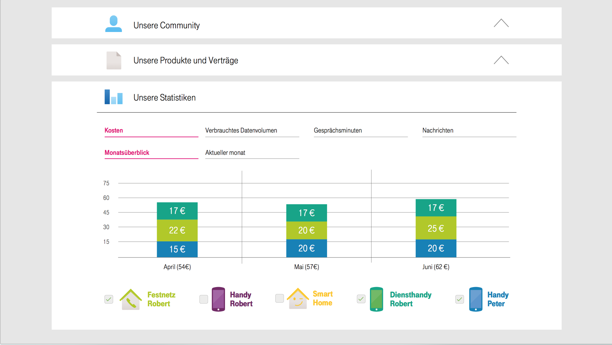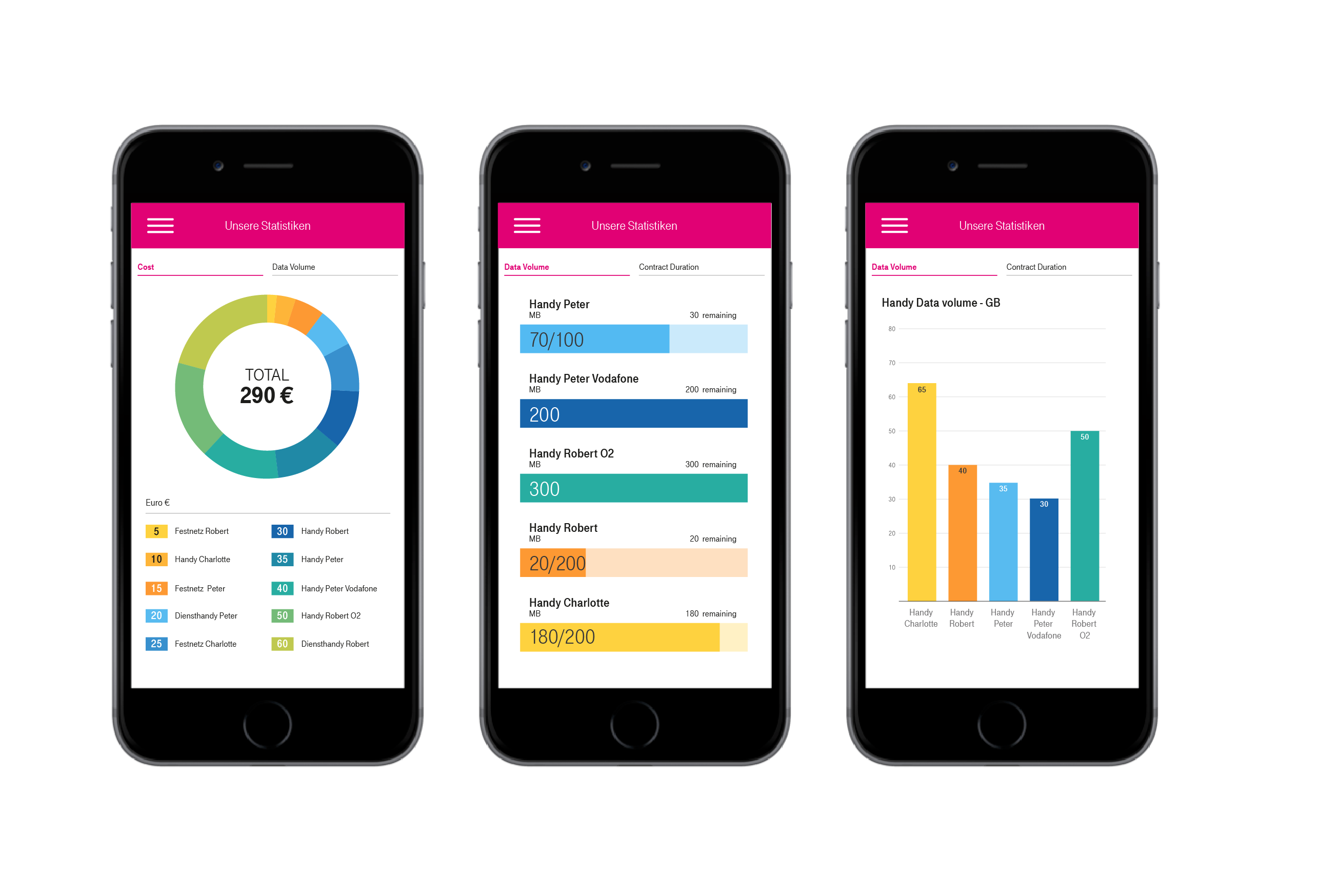 During my work at T-Labs, I contributed to data visualizations for Telekom’s family plans, helping users understand their spending and usage across accounts. I created mockups, prototypes, and visualization examples.